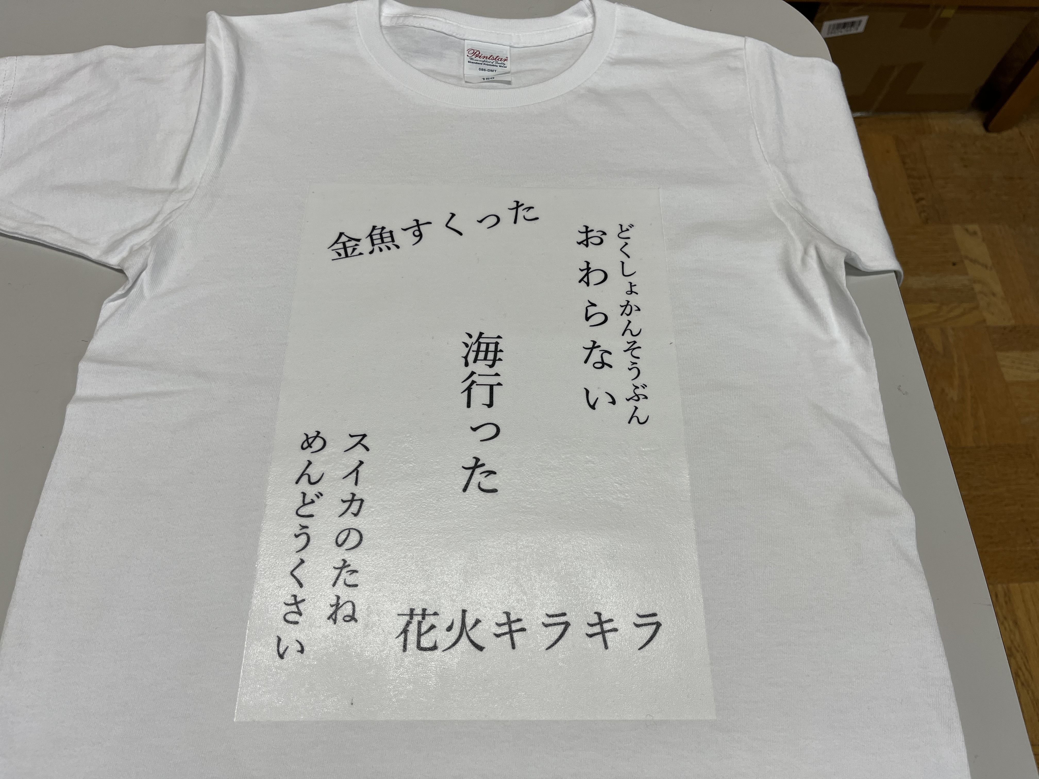 昨年から夏休みこどもの文学講座を開催していますが、今年も8月17日(木曜日)に追分公民館においてなおやマンこと島崎直也氏としま:アイこと島崎アイコ氏を講師に迎え「ことばTシャツ~夏の思い出をとじこめたTシャツづくり~」を開催しました。においや味から連想する夏の思い出を文字におこし自分だけの思い出Tシャツを作成しました。