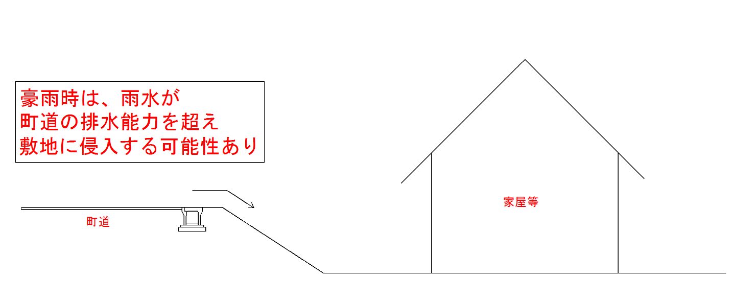 しかし、近年は集中豪雨(ゲリラ豪雨)が多発しており、谷状になっている道路や、道路面より低い位置の家屋等建造物など、雨水が集中しやすい地形の箇所は、町で対策が可能な、町道上の施策には限界があり、解決できない場合がございます。