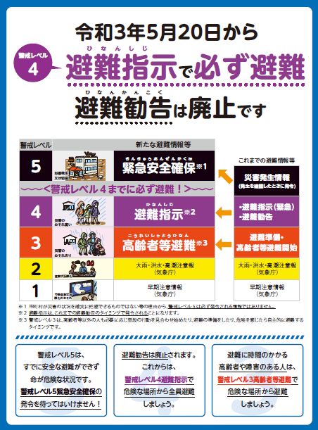 令和3年5月20日付で、災害対策基本法の一部を改正する法律が施行され、「避難勧告」と「避難指示(緊急)」は「避難指示」に一本化されます。 災害発生のおそれがある状況で、避難指示が発令されましたら、必ず、危険な場所から全員避難してください。